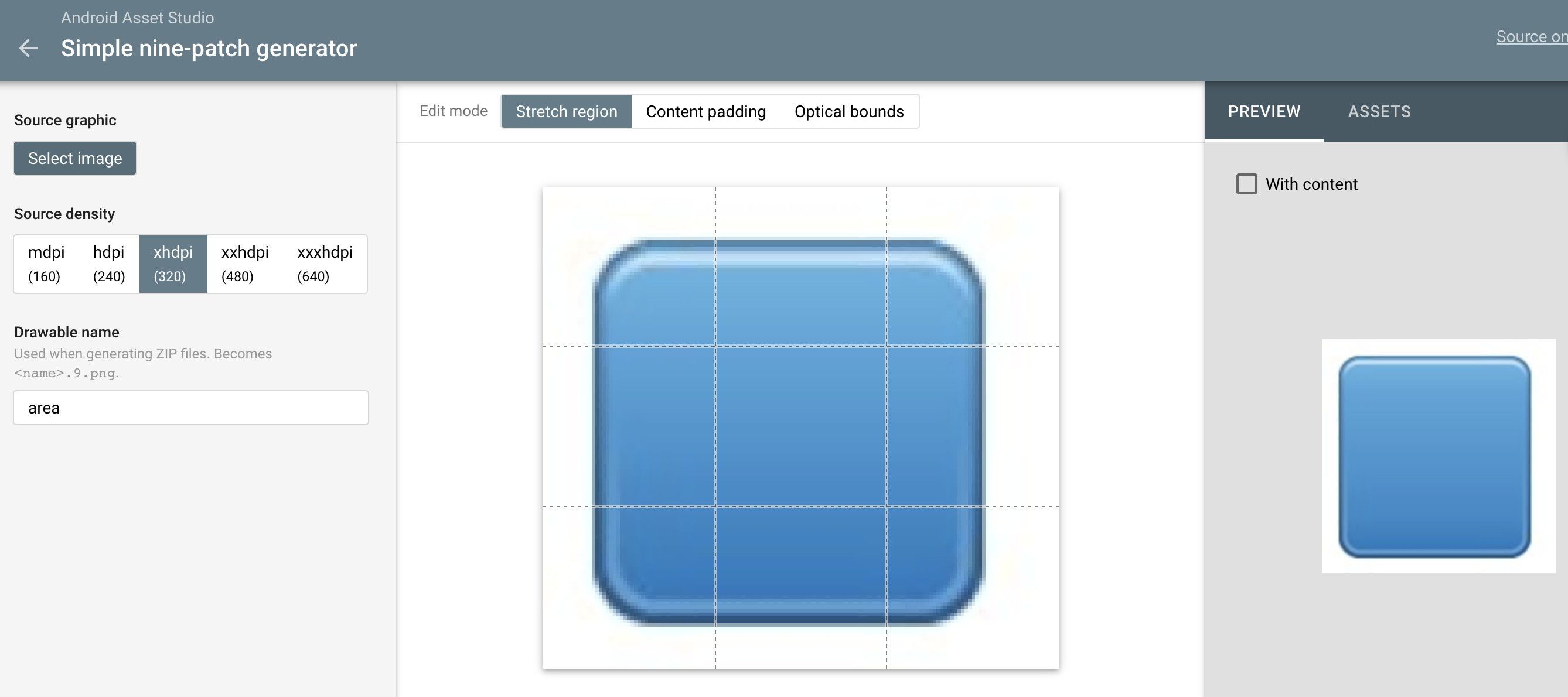 우측의 'Preview'에서 'with cotent' 체크박스를 클릭하면, 안드로이드 스튜디오 개발툴에서 나인패치 이미지 생성 했을 때의 방법과 마찬가지로 컨텐츠 확장 영역을 확인할 수 있습니다.