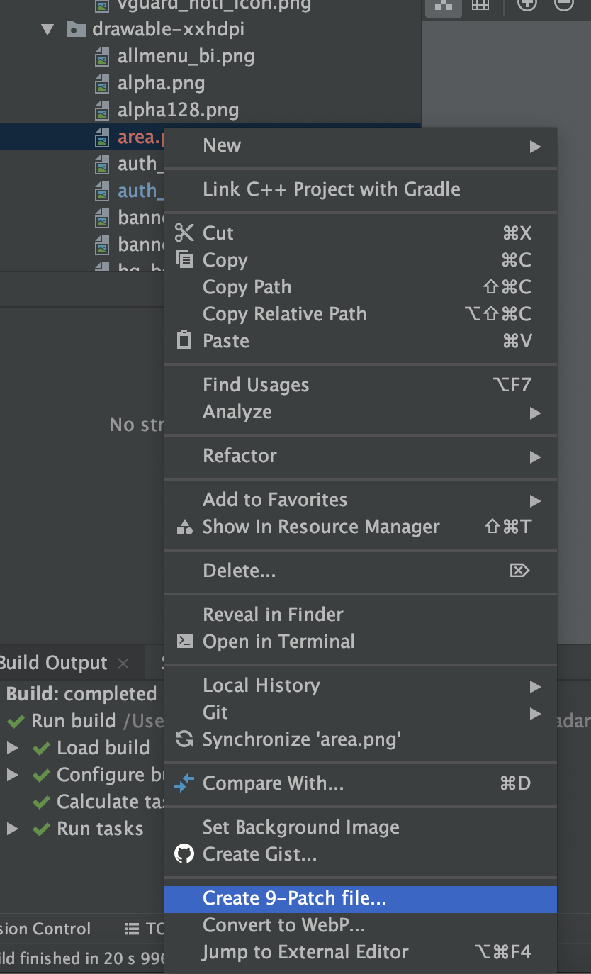 안드로이드 스튜디오 res > drawable 디렉토리에 내에서 나인패치 적용할 이미지가 있다면, 'Create 9-Patch file...'을 클릭합니다.