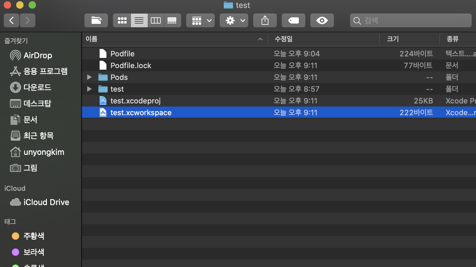 그럼 아래처럼 앱명.xcworkspace 파일이 생성되고, 앞으로 작업할때 이 워크스페이스 파일을 클릭하여 개발자가 원하는 라이브러리를 임포트에서 사용하면 됩니다.